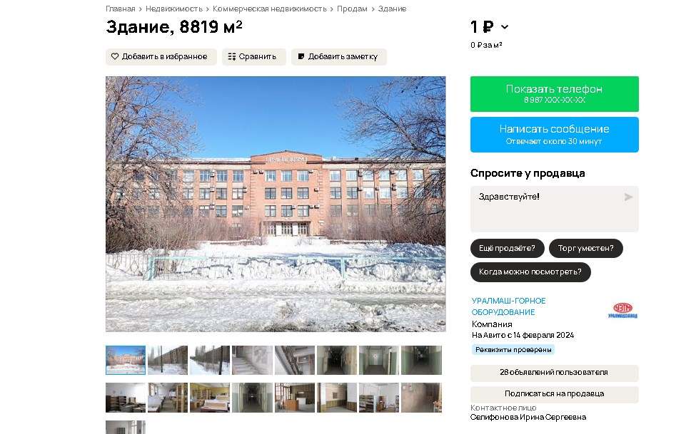 На сайте бесплатных объявлений разместили информацию о продаже инженерного корпуса Южно-Уральского машиностроительного завода, расположенного на проспекте Мира.