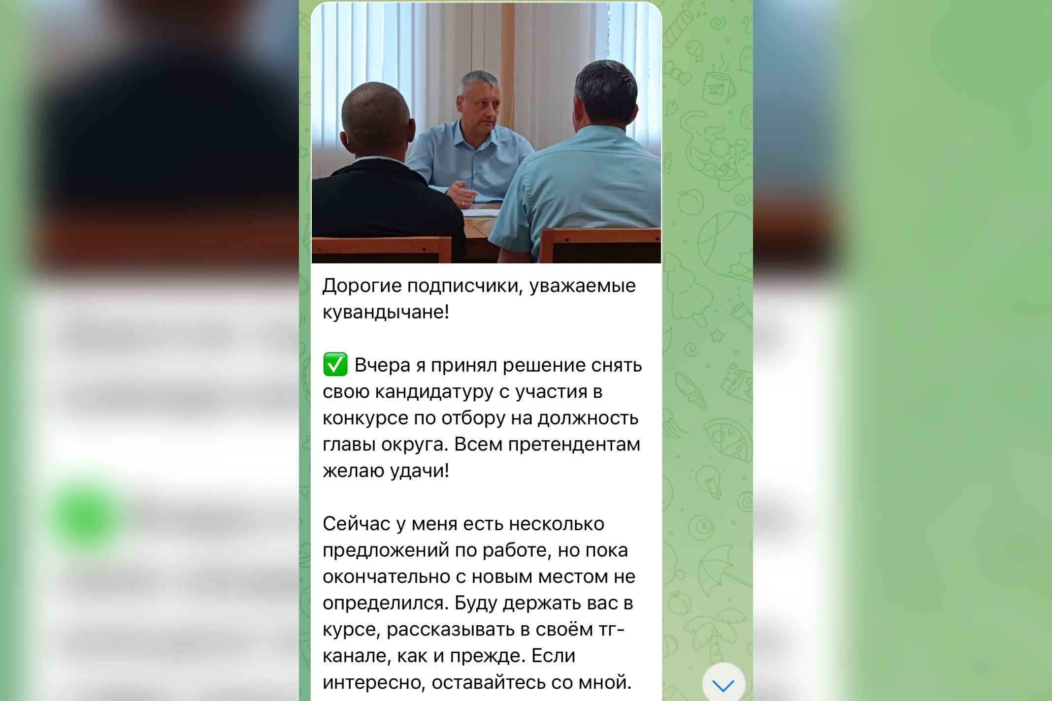 Исполняющий обязанности главы округа объявил о своем решении через социальные сети.