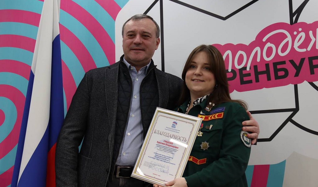 Секретарь регионального отделения партии «Единая Россия», депутат Государственной Думы Олег Димов отметил благодарностью заместителя председателя Молодежного парламента Оренбургской области Кристину Гриценко.