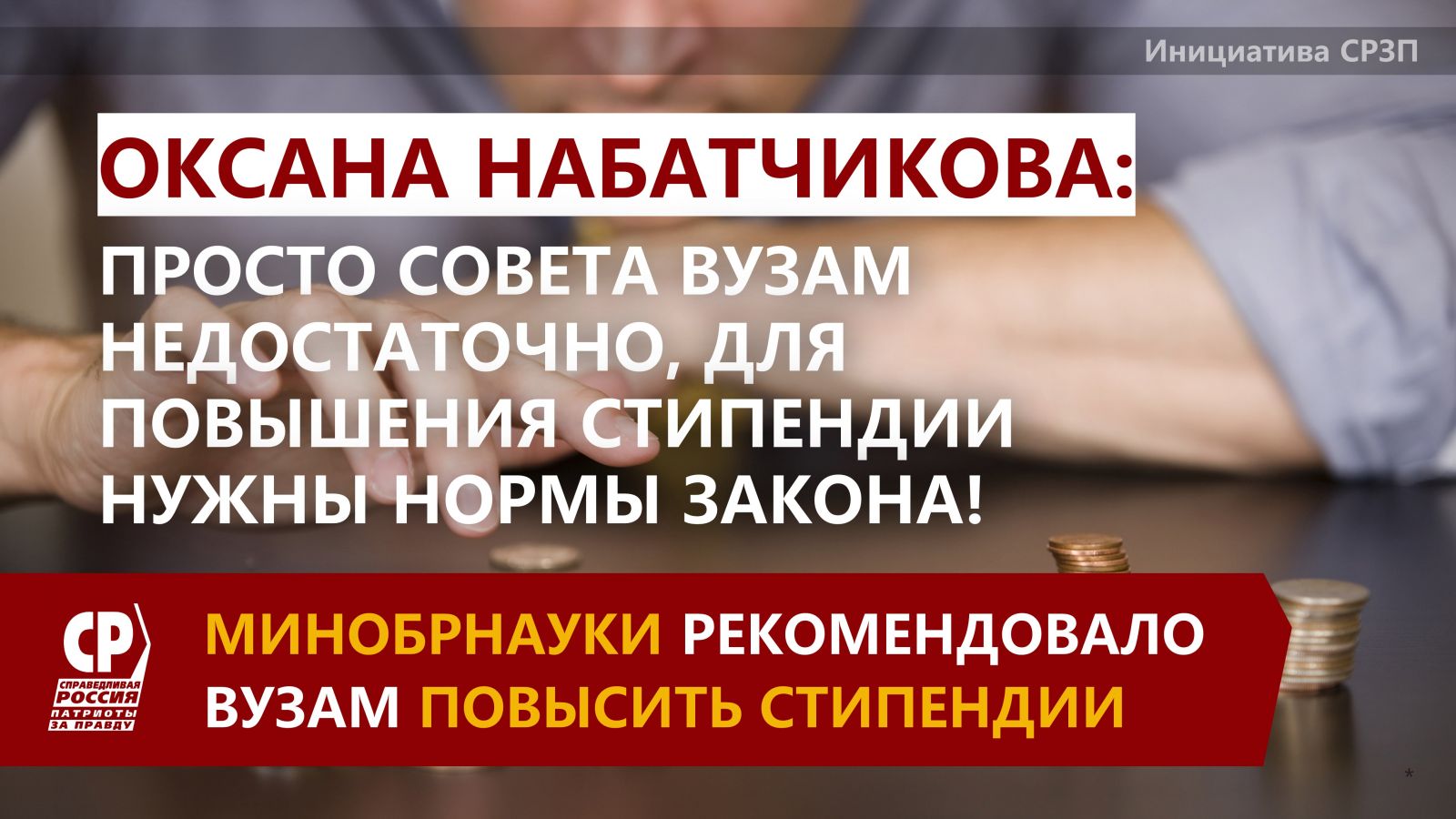 "Просто совета вузам явно недостаточно. Для повышения стипендии нужна нормы закона – подчёркивает Оксана Набатчикова, председатель Совета регионального отделения партии – "студенты говорят о большой актуальности этой проблемы. Сегодня есть запрос и на различные стимулирующие выплаты для студентов, которые учатся на коммерческой основе. Студенты должны учиться, а не разрываться между учебой и поиском заработка" – заключил политик.