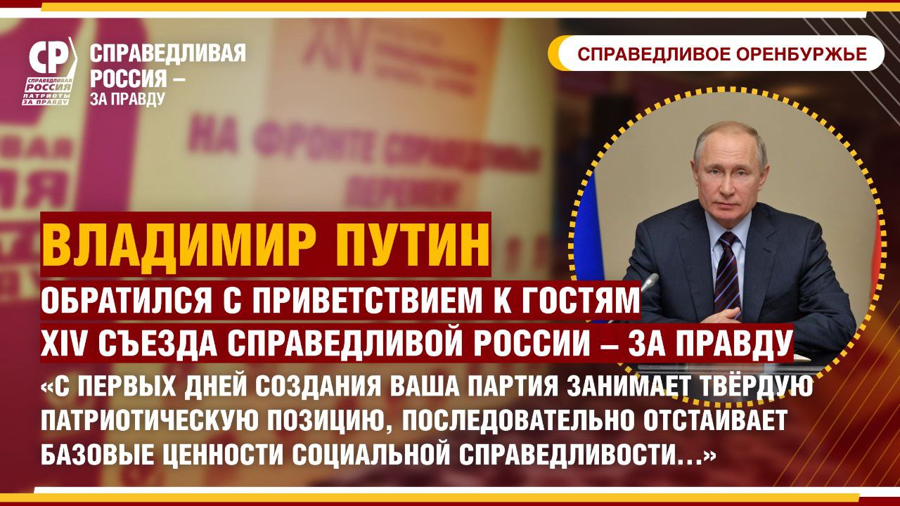 В приветствии Президент сказал: "Приветствую делегатов и гостей XIV съезда Социалистической политической партии 'СПРАВЕДЛИВАЯ РОССИЯ – Патриоты – ЗА ПРАВДУ'."