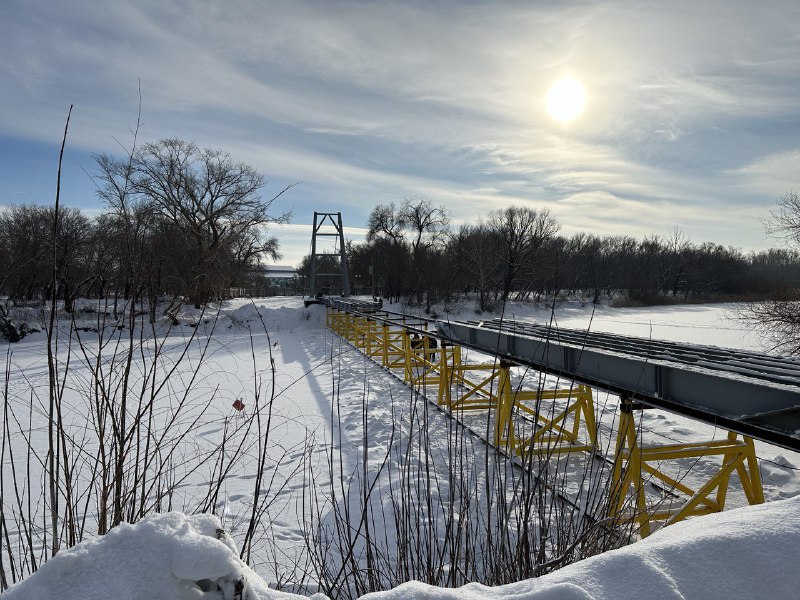 Он отметил, что лёд на Песчаном плотный и его толщина выдерживает многотонную конструкцию. В одно целое соединят 5 пролётов. Сооружение будут держать 8 стальных тросов.