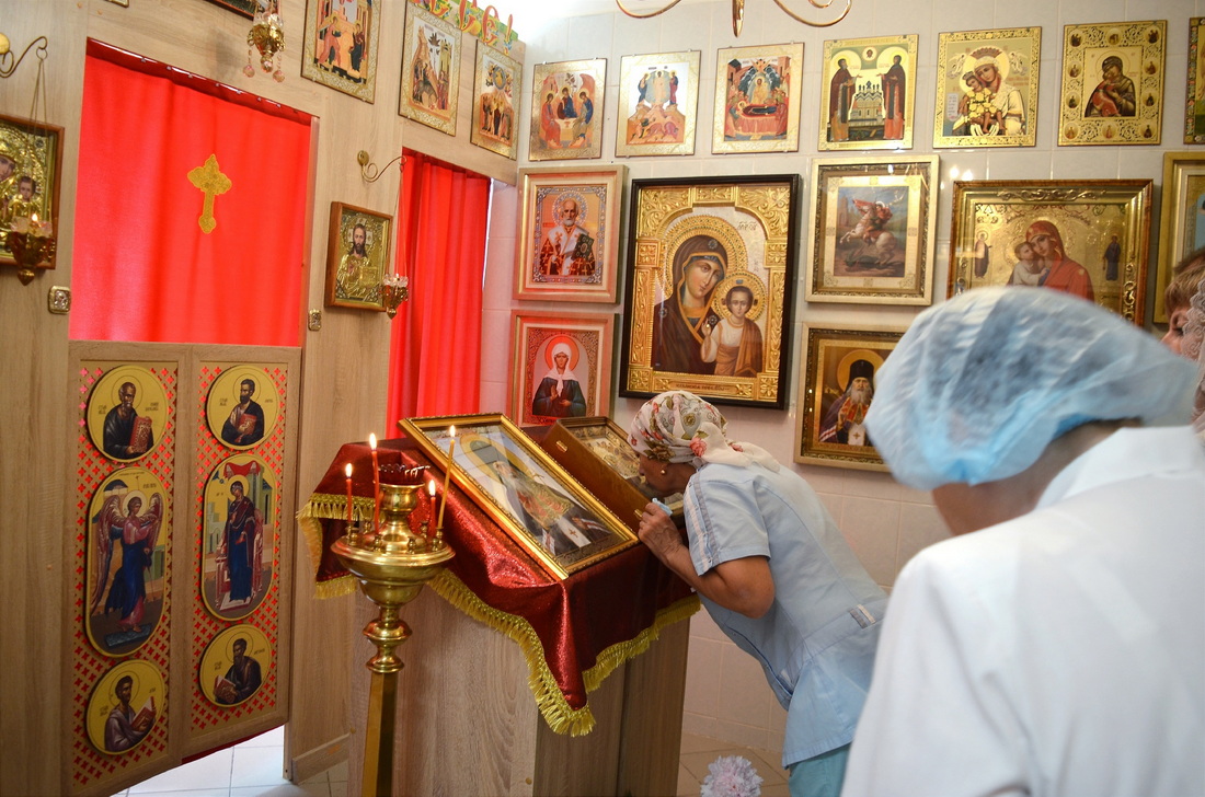 Стоит также отметить и то, что в коридоре лечебного учреждения над указателем, в котором говорится о местонахождении больничного храма, появилась новая икона, приобретённая перед Великим постом на пожертвования сотрудников и пациентов храма. На иконе святитель Лука (Войно-Ясенецкий) изображён во врачебном одеянии (халат и шапочка) с панагией.