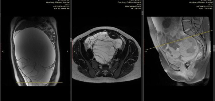 Девочку доставили в экстренное приёмное отделение ОДКБ с жалобами на сильные тянущие боли после физнагрузки. У ребенка было чувство распирания при положении «лежа на животе», сильно вырос живот. УЗИ и МРТ показали плотное объемное образование гигантских размеров 35 х 24 х 16 см, занимающее всю брюшную полость.